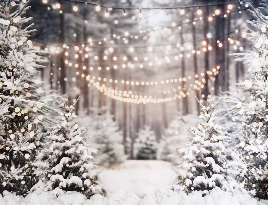 Photos amongst the snowy pine trees lit by strings of fairy lights.